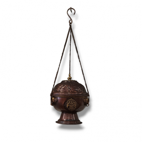 Incensario de cobre realizado completamente a mano, especialmente útil para quemar incienso en piedra, conos y cordón. Puede apoyarse en su base o bien colgarlo mediante las cadenas que lo acompañan.