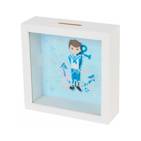 Hucha de madera comunión niño con frase "Mi primera comunión" en la parte delantera del cristal.
