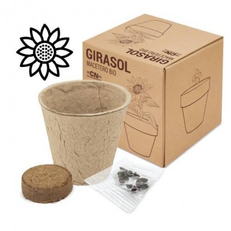 Maceta biodegradable con semillas de girasol presentada en caja de cartón. Incluye bolsa con semillas y tierra e instrucciones en español e inglés.
