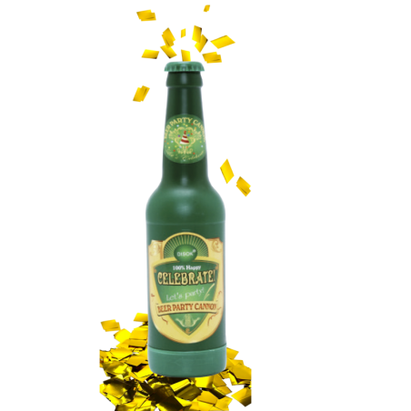 CAÑON CONFETIS DORADO EN FORMA BOTELLA CERVEZA