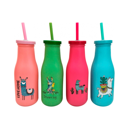 Botella de cristal con tapa metálica y caña de PVC a juego.