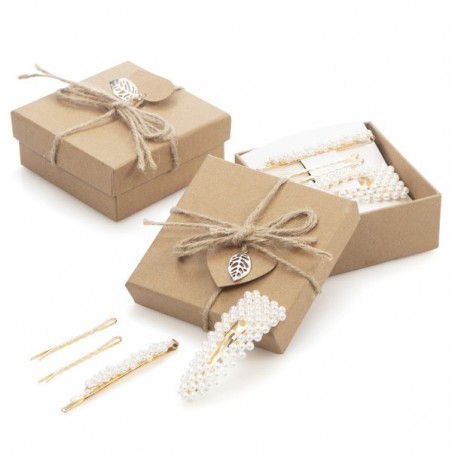 Pasadores decorados con perlas presentados en caja de cartón kraft con lazo de rafia.