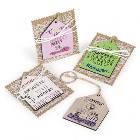 Llavero de madera con frases en forma de casa, presentado en cartón kraft con lazo de rafia.