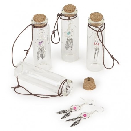Pendientes atrapasueños de metal plateado con bolita de diferentes colores, presentados en tarro de cristal con tapa de corcho.