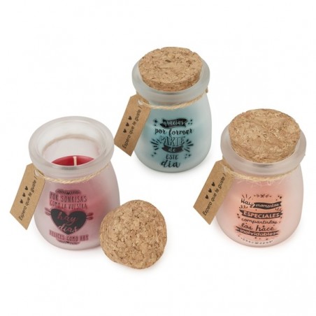 Vela en tarro de cristal mate con frase y tapón de corcho.