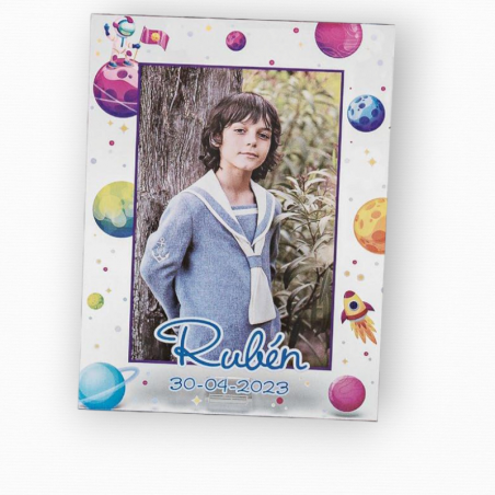 PORTAFOTOS METACRILATO PLANETAS PERSONALIZADO CON FOTO IMPRESA LETRAS AZULES