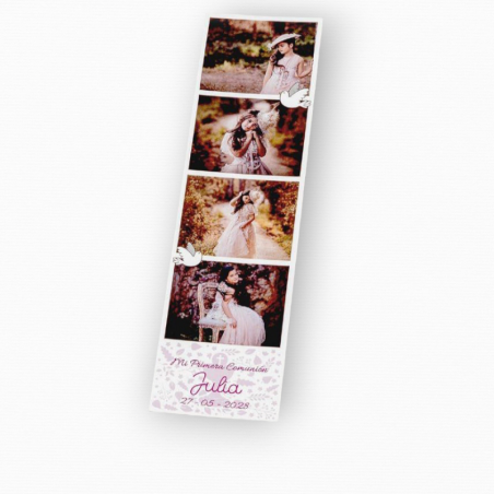 IMÁN TIRA FOTOMATÓN PERSONALIZADO 4 FOTOS MOTIVOS COMUNIÓN LETRAS ROSAS