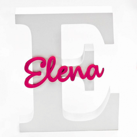 INICIAL MADERA LACADA BLANCA PERSONALIZADA CON NOMBRE METACRILATO FUCSIA