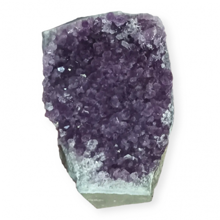 Esta amatista procede de Uruguay y tiene la base cortada para que se pueda posicionar verticalmente.