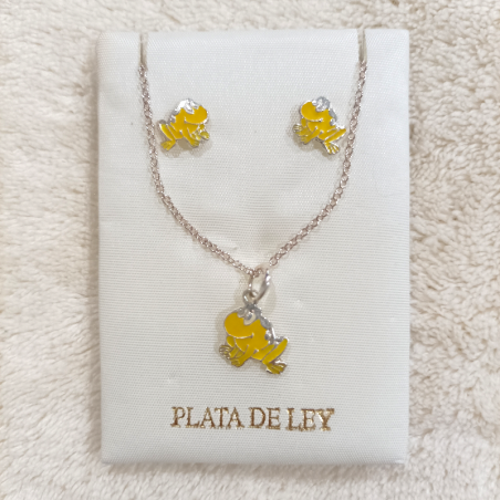 Compuesto por pendientes, colgante y cadena de plata de ley con decoración de esmalte y diseño de ranas amarillas.
