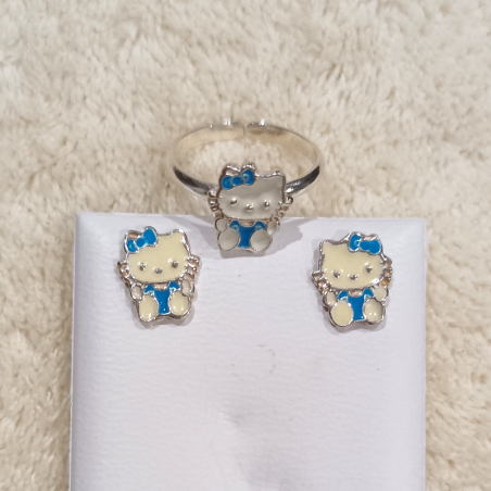 Conjunto de plata de ley con diseño gatita con lazo azul decorado con esmalte y compuesto por pendientes y anillo adaptable.