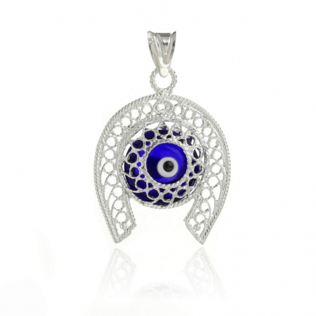 Colgante realizado en filigrana de plata de ley con un ojo turco de vidrio azul oscuro en el interior.