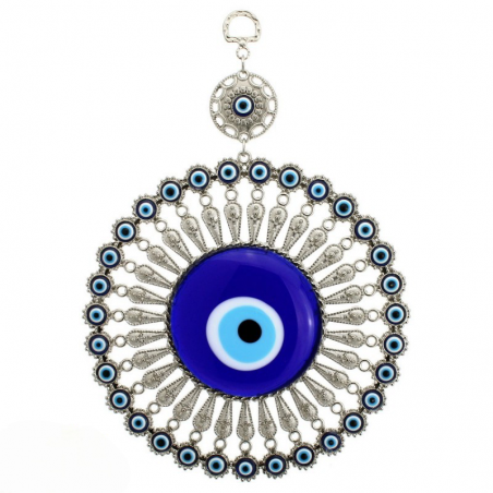 Bonita pieza decorativa de metal con calados y un gran ojo turco de vidrio tipo murano en el centro. Producto artesanal de Turquía.