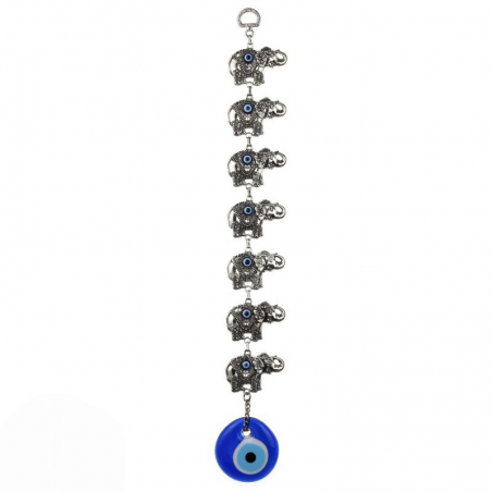 Decoración de pared amuleto de protección con siete elefantes de metal plateado envejecido y terminación ojo turco de vidrio tipo murano. Artículo procedente de Turquía.