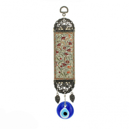 Amuleto de protección decorativo para pared con miniatura de alfombra y ojo turco de vidrio tipo murano.