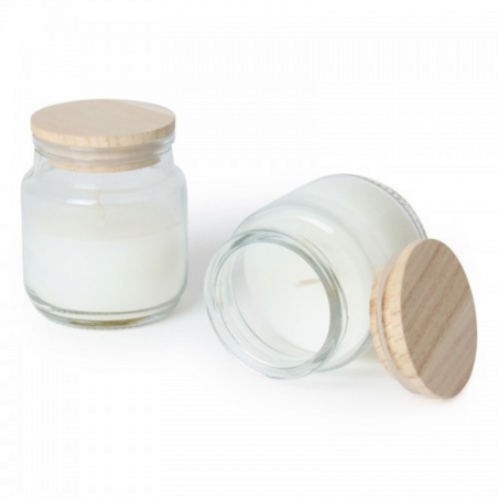 VELA BLANCA EN TARRO CRISTAL TAPA MADERA
