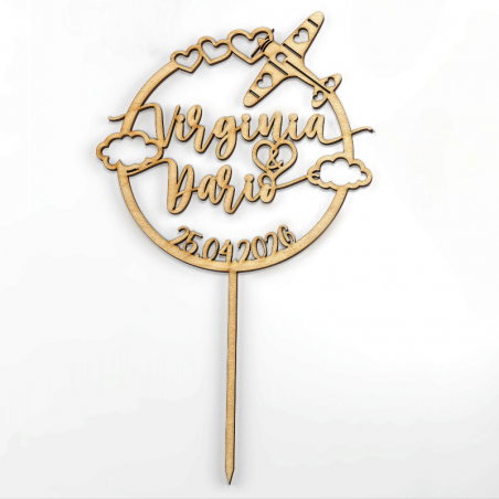 DECORACIÓN PARA TARTA MADERA AVIÓN CORAZONES PERSONALIZADA