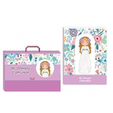 Album de firmas comunión, presentado en un práctico maletín de cartón rígido con asa de pvc con diseño de comunión niña y detalles florales.